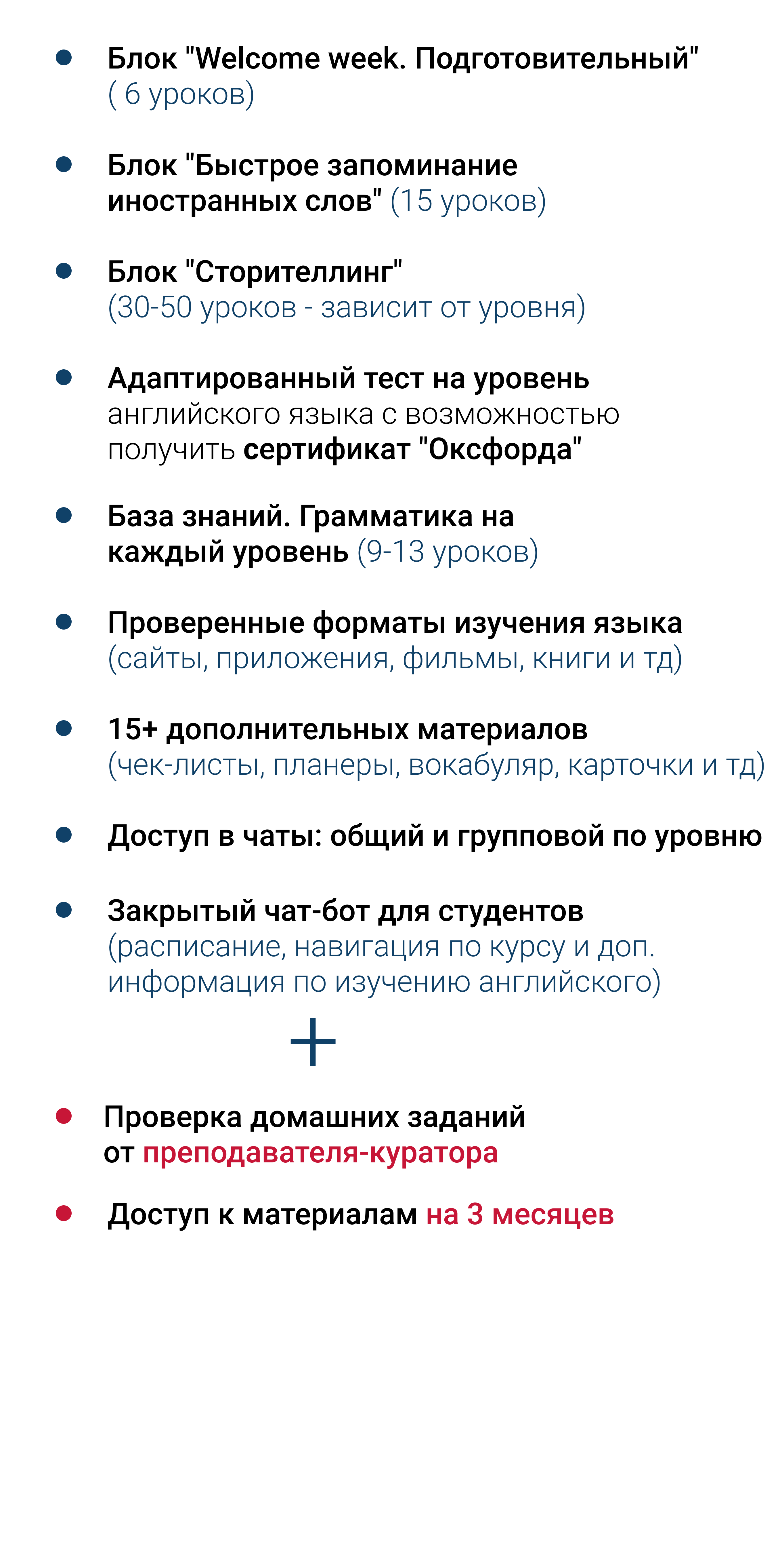 Поставите цель в изучении английского языка, рассчитаете конкретное время до цели и распланируете обучение. Подберете доп. материалы для дальнейшего прохождения курса